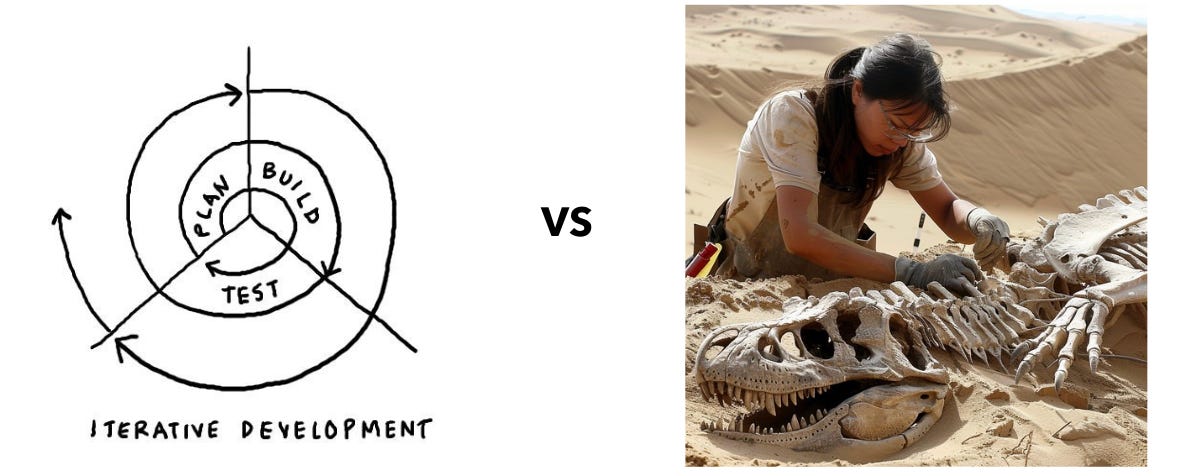 If iteration is an infinite cycle of test-improve-test again, the humanities approach is digging. You chip away until you strike gold — or dinosaur bones.